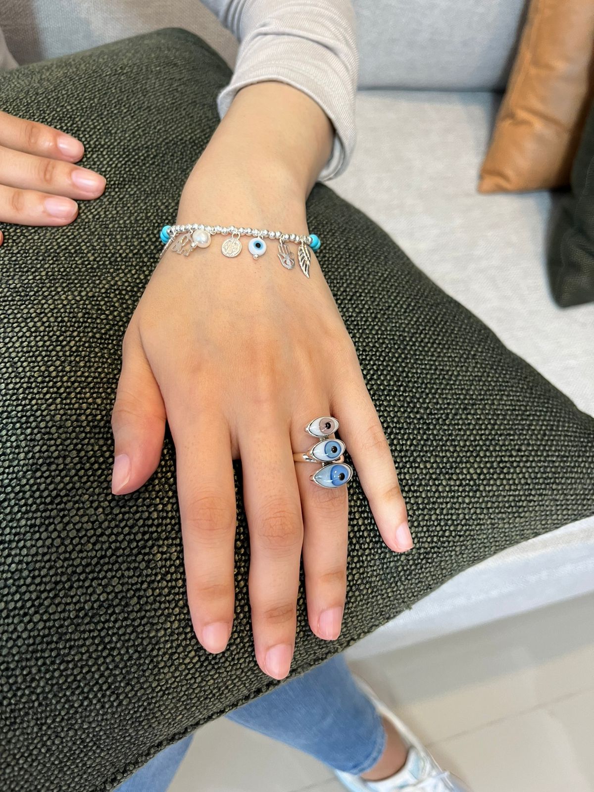 – **Dijes de Protección:** Incluye una variedad de dijes simbólicos como el ojo turco, la mano de Fátima y hojas, cada uno representando diferentes formas de protección y buena fortuna.